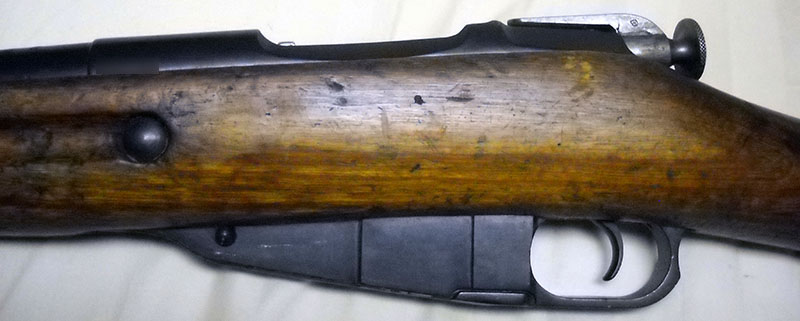 You will note the pitting and discoloration on the bolt face. This is a consequence of the fact that so much Soviet surplus 7.62x54mmR ammunition is fitted with primers that leave a corrosive residue, and previous owners have not been really scrupulous about cleaning the bolt after shooting said ammunition. It looks nasty, but the damage in this case is only cosmetic, and thanks to the modular design of the bolt, if I really had to I could replace the bolt head for about $30 without having to toss out the rest of it.